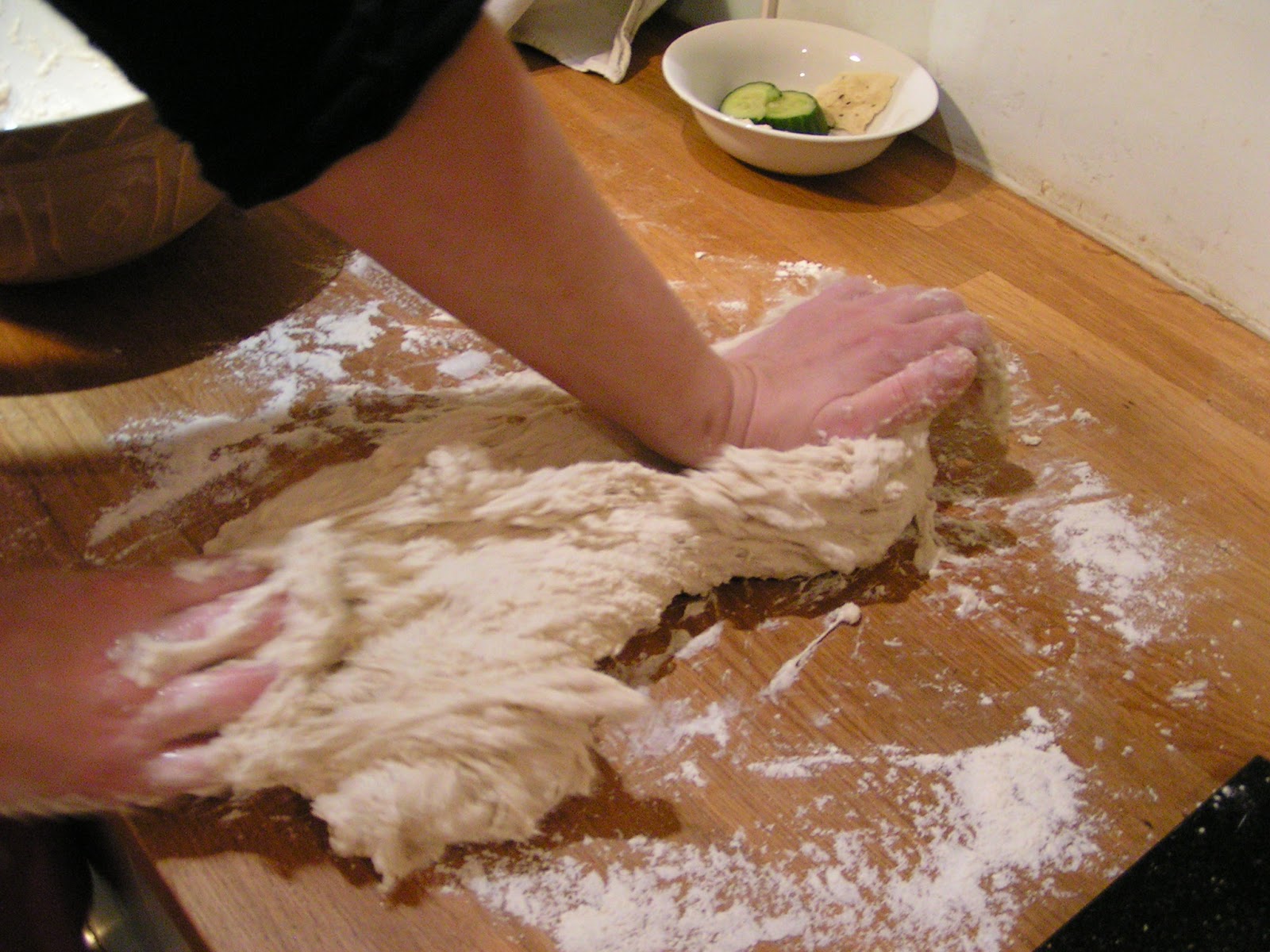 Empty out the dough onto a floured worktop. Then you need to knead. Now you can imagine that it was a bit tricky to take these photos, what with my hands covered with dough, so I enlisted the Husband to help. As I kneaded, he snapped away. Please ignore the bowl of mouldy cucumber slices and old pasta destined for the chickens there in the background.